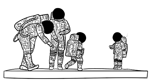 On se rapproche, et la photo m'intrigue. Ce sont... des astronautes habillés en wax ! Ma colère faiblit. Je demande à Christine ce que c'est. Elle m'apprend que c'est une œuvre d'un artiste britannico-nigérian, Yinka Shonibaré. Et qu'il est en fauteuil roulant, aussi. Je comprends mieux pourquoi l'image des astronautes me parle autant... combien de fois j'ai rêvé, moi, de devenir astronaute, comme Fatoumata Kebe ! Sentir que la gravité n'existe plus, sortir de cette pesanteur permanente et goûter à la liberté de l'impesanteur...